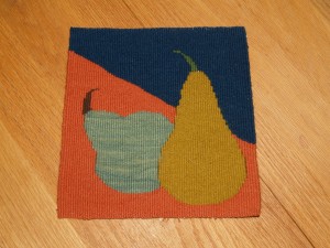 Archie Brennan set the Wednesday Group a project to weave pears. He was fascinated by pears and woven a number of pieces himself that feature this fruit. 8″ x 8″, cotton warp, wool weft, 8 epi. Woven for the unjuried, small format exhibition in 2010.