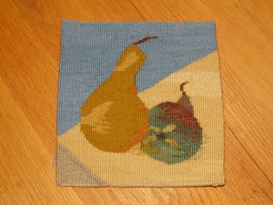 “Pears II” Leave a Comment / By ozweaver / November 7, 2012 A second exercise in weaving pears. 8″ x 8″, cotton warp, wool weft, 8 epi.