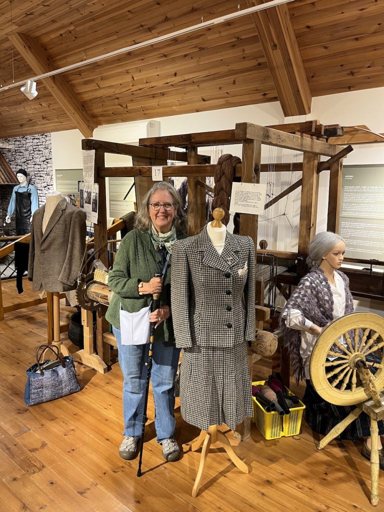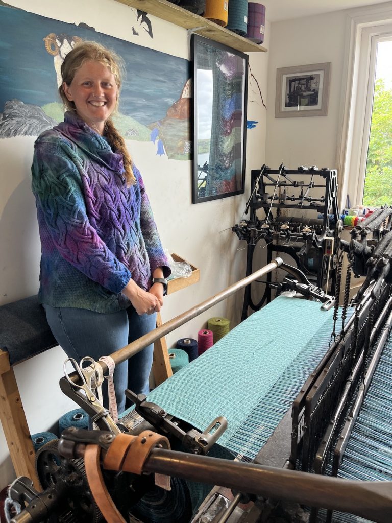 Tom wanted us to meet another Harris Tweed weaver who has left the company to start her own business, Three Sisters’ Weaving Shed. Since I’ve been home I’ve enjoyed following these three sisters, one husband, and one small daughter through the photos they post on Facebook. I bought a hand painted merino/silk skein dyed by the sister in this photo, who is also the mother of the little girl and the wife of the man in the group. I’m using it in a knitting project, “Golden Poppy” by Elenor Mortensen. I’m almost finished (not obvious in the photo) which will make another project bought and executed in a rather brief space of time! The rest of the yarn is Jamieson “spindrift.”