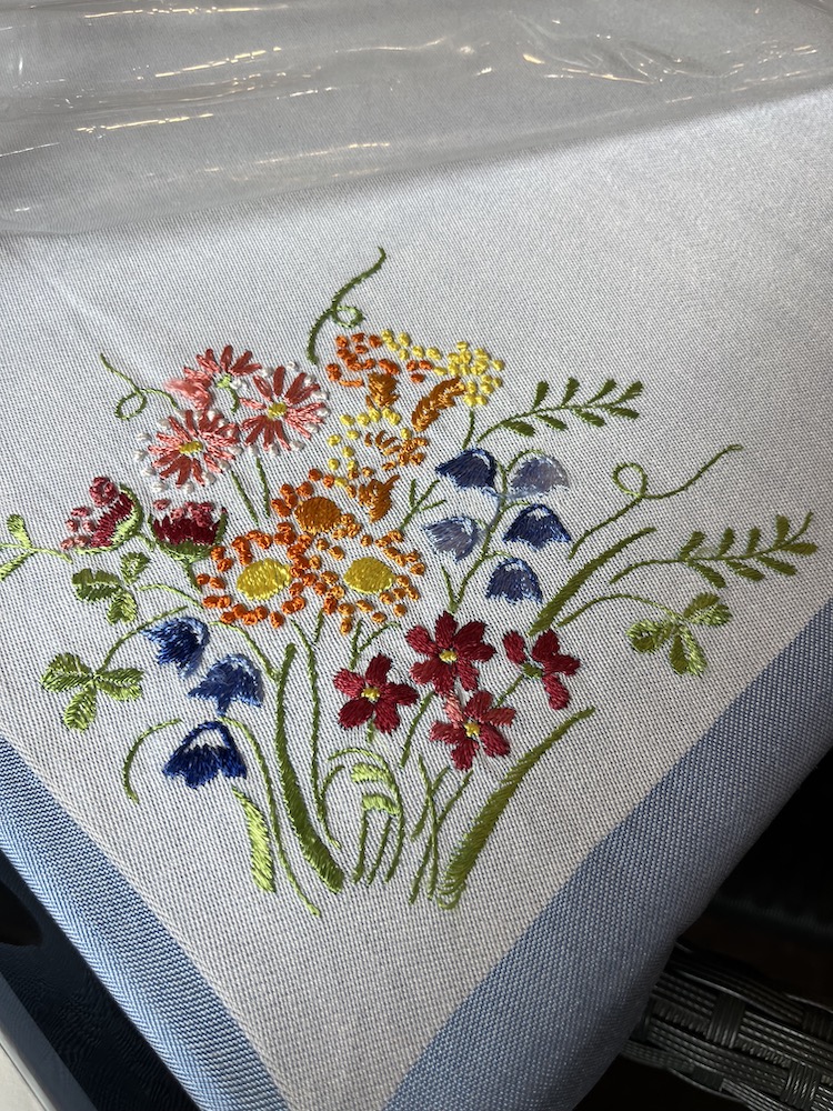 Here is our table. I pulled aside the plastic cover to better enjoy the embroidery that was done on each corner of the cloth.