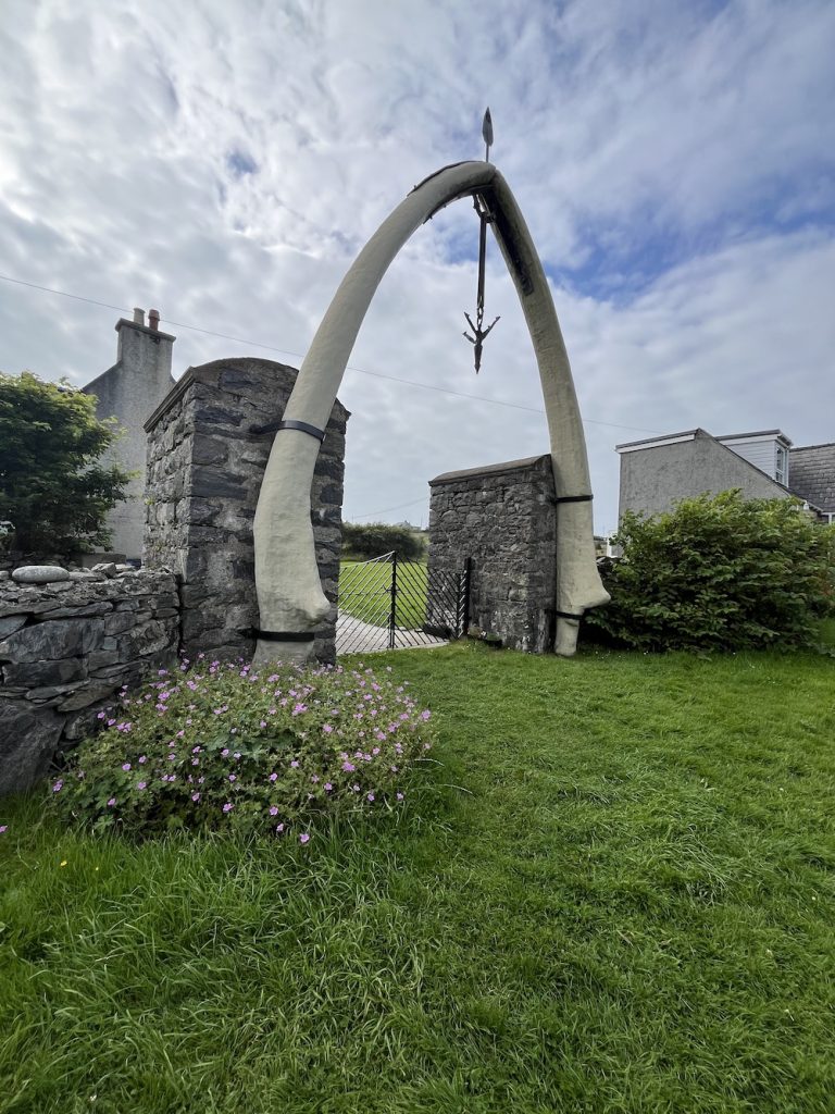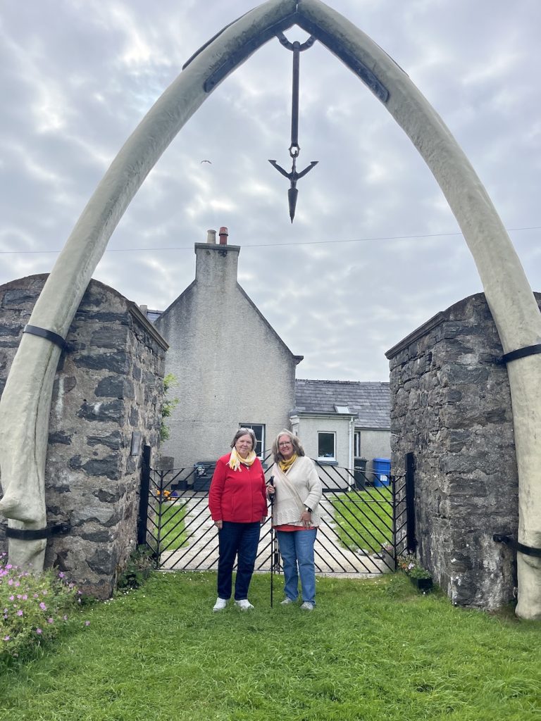 …and two of Kari and me visiting the large whale jaw bone installed in the village of Bragar on the Isle of Lewis.