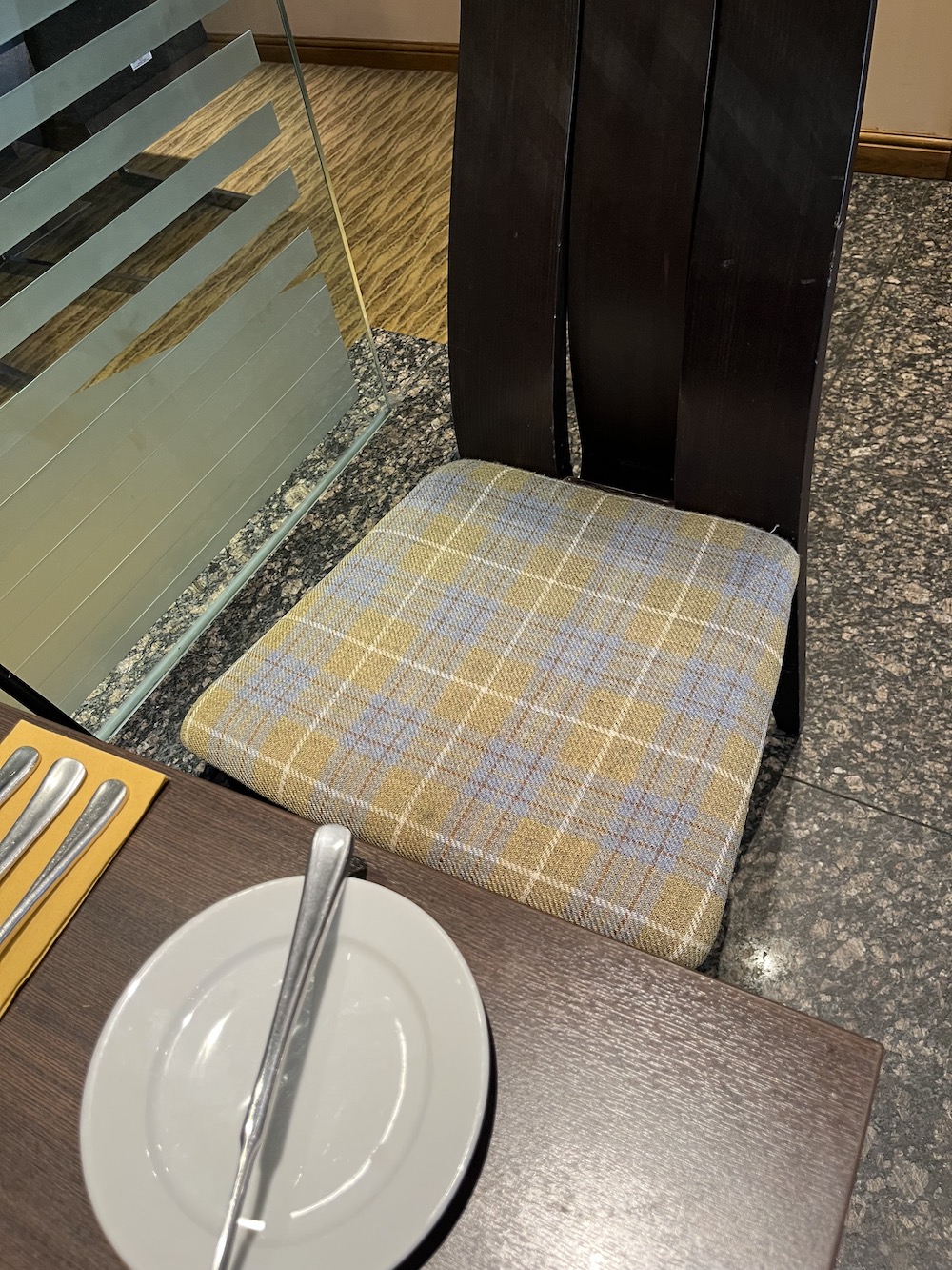Breakfast and dinner at this hotel featured dining chairs with Harris Tweed fabrics, as well as handwoven napkins (although not wool).
