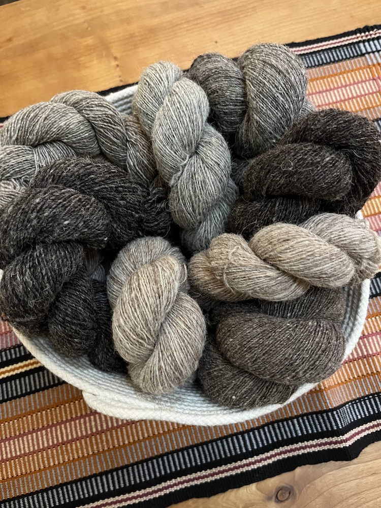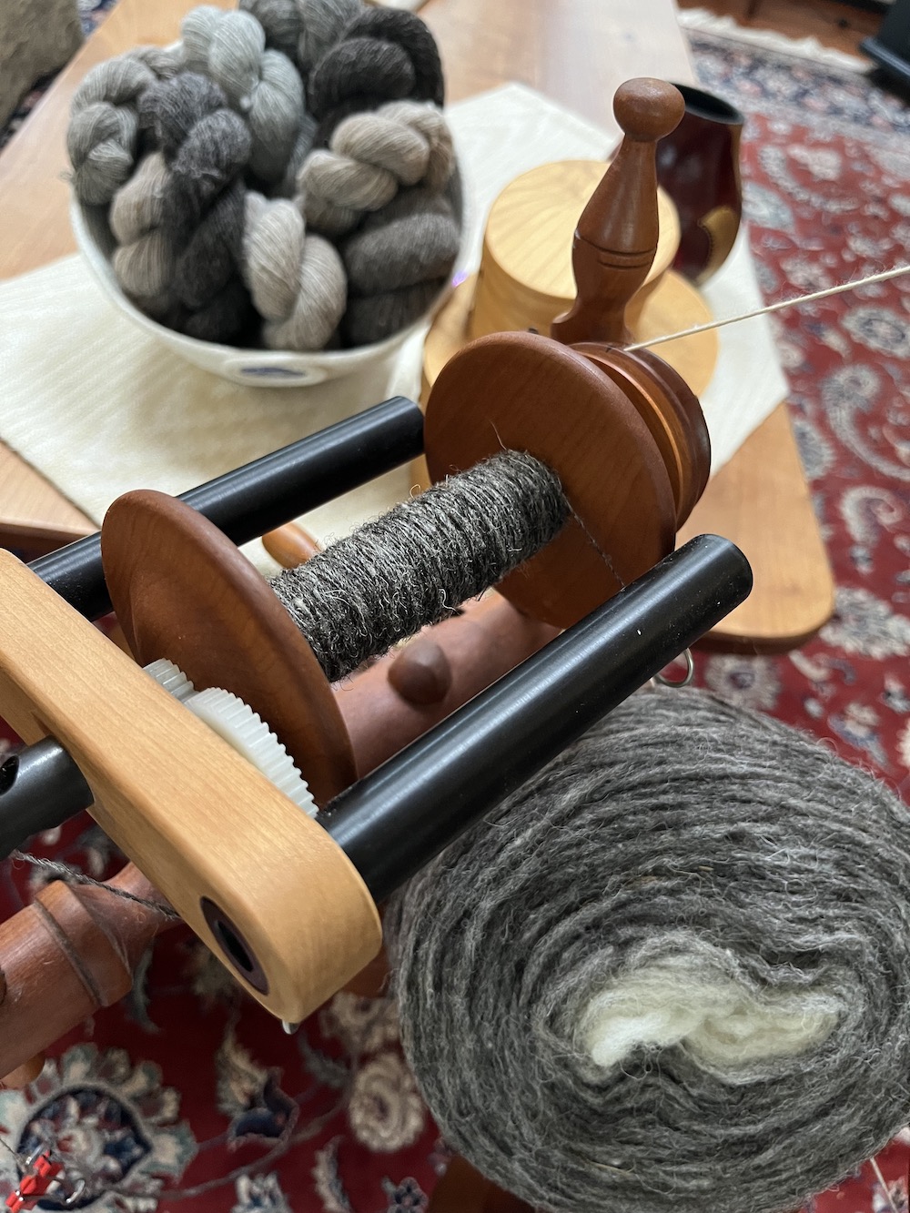 We had two days on South and North Uist, and we saw a wool spinning mill where I bought some exciting things, including a batch of single spun Hebridean wool in natural colors. They spun this wool for someone’s specific project, and what I bought was all there is. I am planning the warp right now, which is pretty prompt of me, only five months after buying it! I also bought three ‘cakes’ of pencil roving that shades from the darkest natural to almost white. I gave away one cake and have spun the other two….not sure what that will become.