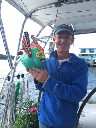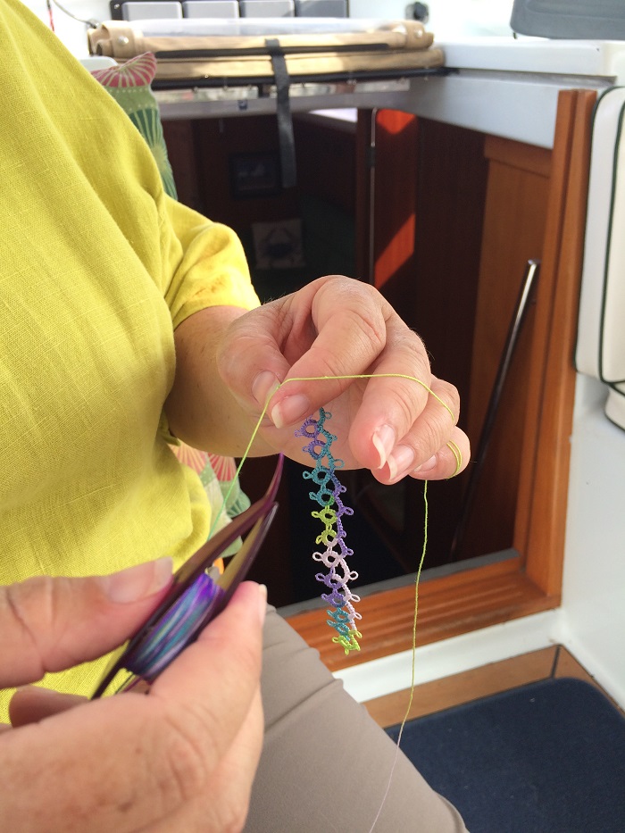 I enjoyed our evening with him in particular because he is the first person on this journey with whom I could talk a little about weaving and know that he would understand! Isn’t it interesting that after 4 years of sailing about this area I encounter a man who knows enough about weaving to listen to me talk about what I miss from home! One of my dearest friends is Norwegian, and there were noticeable about Lars that reminded me of her. I don’t know if that is because they both come from the same area of Norway, or if I was just bound to find them similar because I’ve been away from home so long and missing dear friends…. Lars compared the solitude of weaving to the solitude of single-handing his small boat. Also , the amount of preparation a weaver has to do before beginning to weave is similar to preparations for a sailing journey, and the concentration required for both while allowing our minds to enter a zen-like state while weaving or sailing. He was an enjoyable conversationalist for both Bob and me. This morning he left early to keep heading west while we have chosen to stay another day…maybe two.