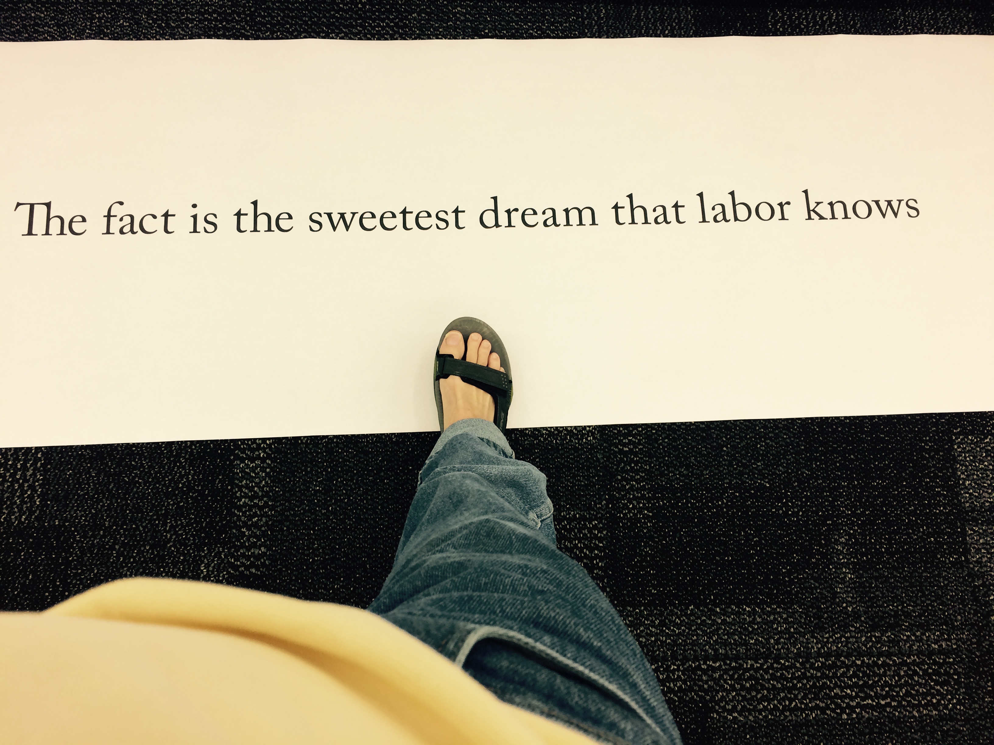 Here is the cartoon I’ll be using for this project. It’s the final line from one of my favorite Robert Frost poems, and it happens to be a favorite with our younger son as well. This tapestry is for him. In this photo I am measuring for possible border sizes.
