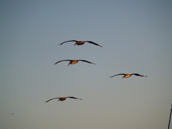 I love how pelicans fly in formation together. Bob took this photo right before sunset when the pelicans are glowing with the last of the light.