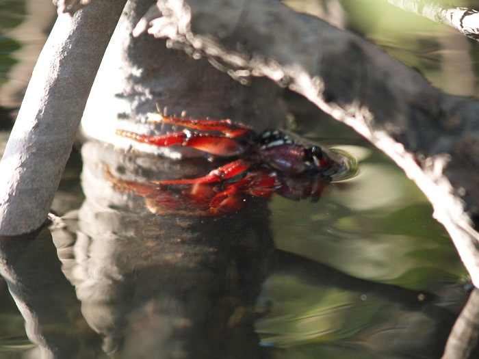 Along the waterway near New Smyrna there are lots of small estuaries, full of mangroves, and nesting/hunting grounds for a wonderful selection of water birds and sea life. While we were underway, Bob saw a number of baby dolphins swimming alongside their mothers. And we saw colorful crabs tucked into the roots of the mangroves. I did not know crabs came in such brilliant colors!