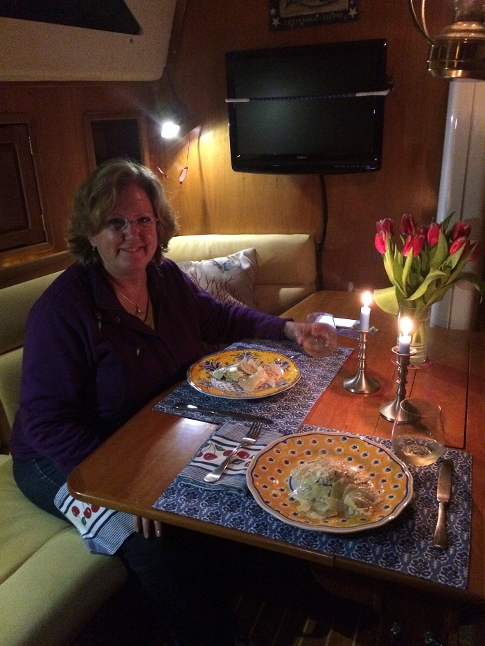 I have been avoiding my computer problems by knitting. I have been knitting for a ridiculous number of hours each day and am racing through the front of the pretty “For Irene” sweater by Carol Sunday. I knitted the back of the sweater while traveling in Portugal, in the fall, then put is aside to finish up the Merle sweater to wear during the cold weather we’ve had while onboard. I got myself in trouble at the beginning of the front of “For Irene” doing the short rows, and with internet so unpredictable on a boat, and with the fear that I might wait days for an email response from Carol, I decided to call her! I felt quite uncomfortable about this, but I really needed to keep knitting so I wouldn’t have to face the overwhelming job of sorting through photos and files on my computer. She actually has her phone number posted on her website, and I could not resist getting instant gratification for my questions.