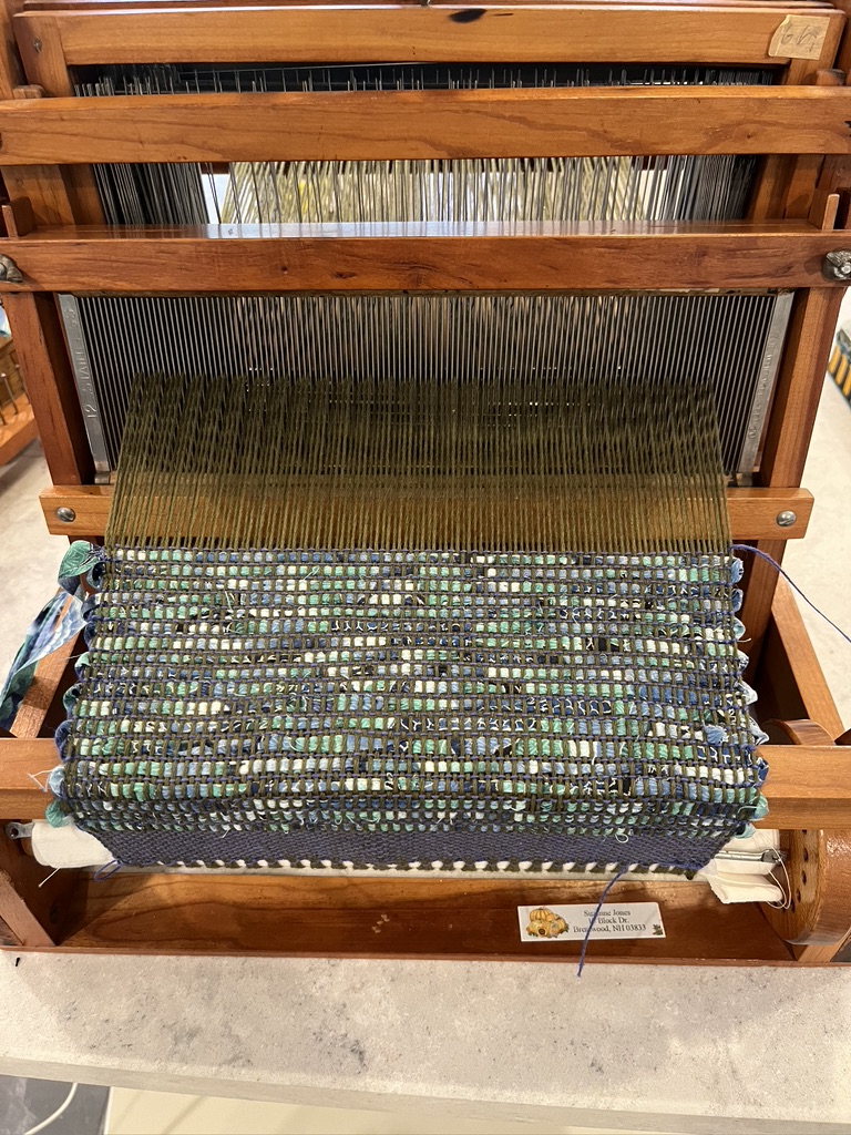This is Maria’s largest loom that requires two weavers and has two sets of treadles. The center of this project is solid wool loops with the large borders woven in plain weave. The wool loops designs are all hand manipulated since this loom has only two shafts that are counter balance.