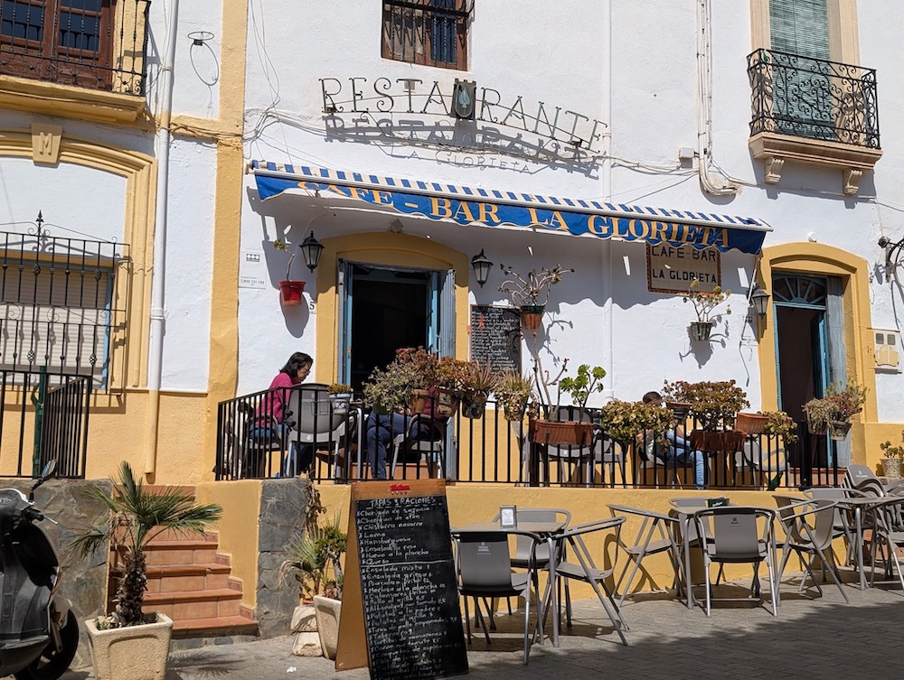 Last year we found a cafe where we wanted to have an afternoon glass of wine and some food before driving back to Almerimar. It was just after 4pm, and they were closing until dinner at 8pm. They could not give us any food, but they did pour us two glasses of wine and asked us to leave our glasses on their door step when we left. They closed the restaurant and left while we had our wine in their scenic spot near the courtyard of a historic church. This year we arrived in time to have wine and a several tapas for lunch.