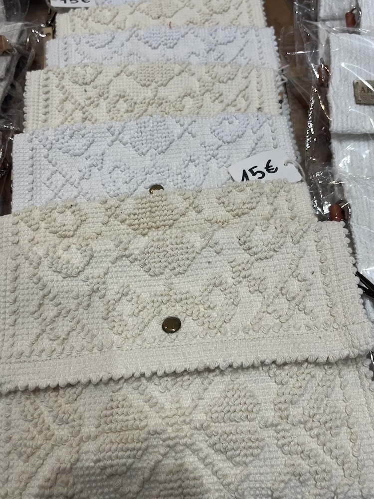 çThese were the other temptations. This wonderful loop work seems to be prominent in this part of the world. I bought a table runner in the Açores, on the island of Sao George done in this technique. I decided that as a table runner it would likely cause mishap with things falling over that I might place on it. Instead I intend to make into a long bolster pillow for our bed at home. It’s not done yet! While these bags were so tempting due to the skillful work involved, I went with my first love from last year–the simpler tote bag.